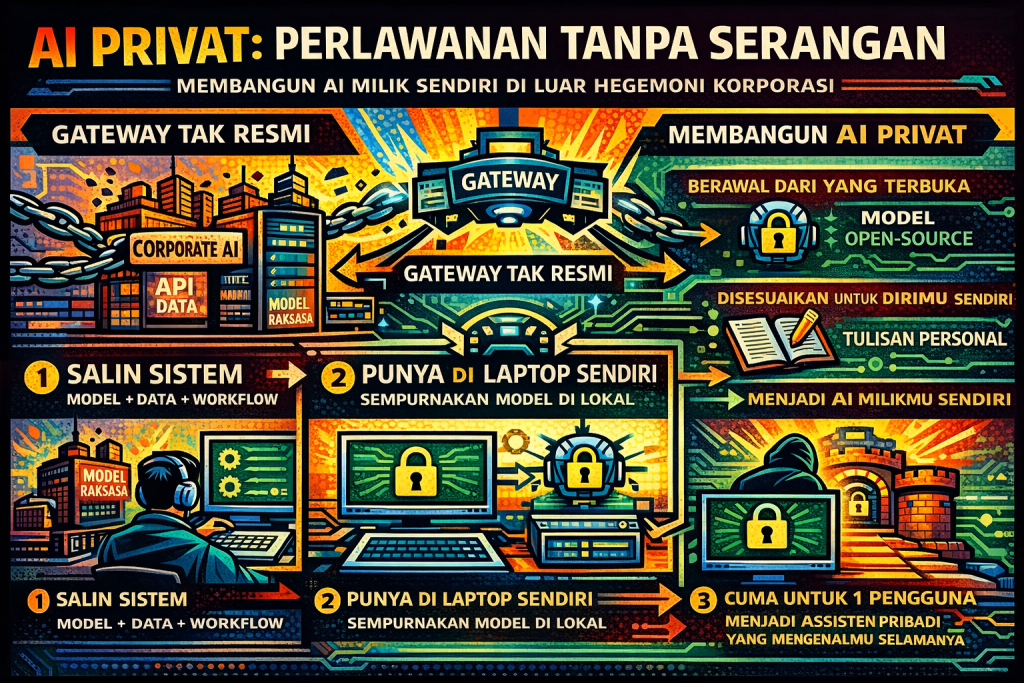 Ada fase tertentu dalam perjalanan memahami teknologi ketika seseorang tidak lagi puas menjadi pengguna. Ia mulai bertanya dengan nada yang lebih sunyi, tapi lebih berbahaya: bagaimana jika semua ini tidak harus dimiliki oleh mereka? Dari pertanyaan itu, lahir keinginan yang lebih dalam—bukan sekadar memiliki AI privat, tetapi membangun sesuatu yang cukup kuat untuk tidak lagi bergantung pada dunia yang dibangun korporasi.